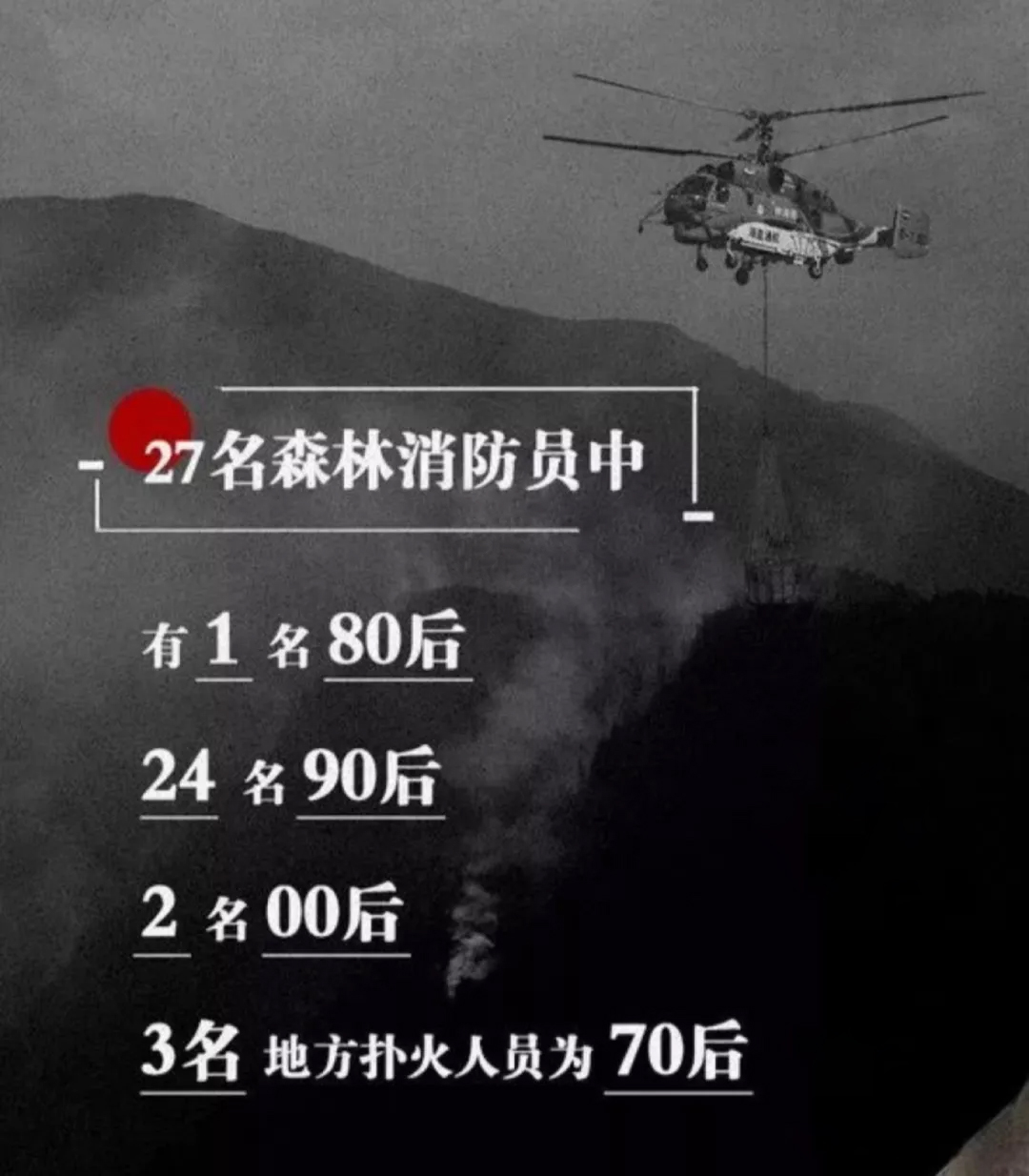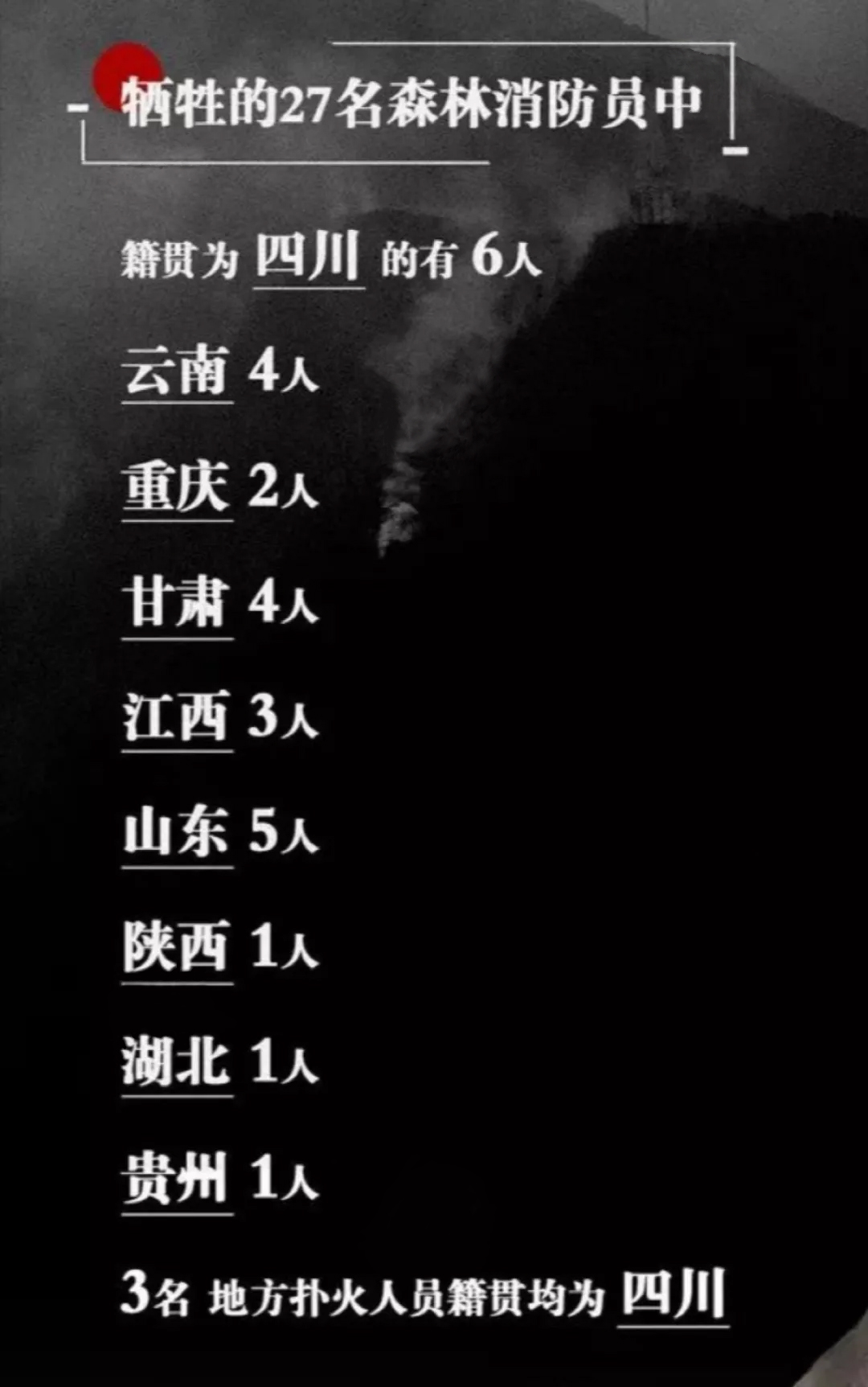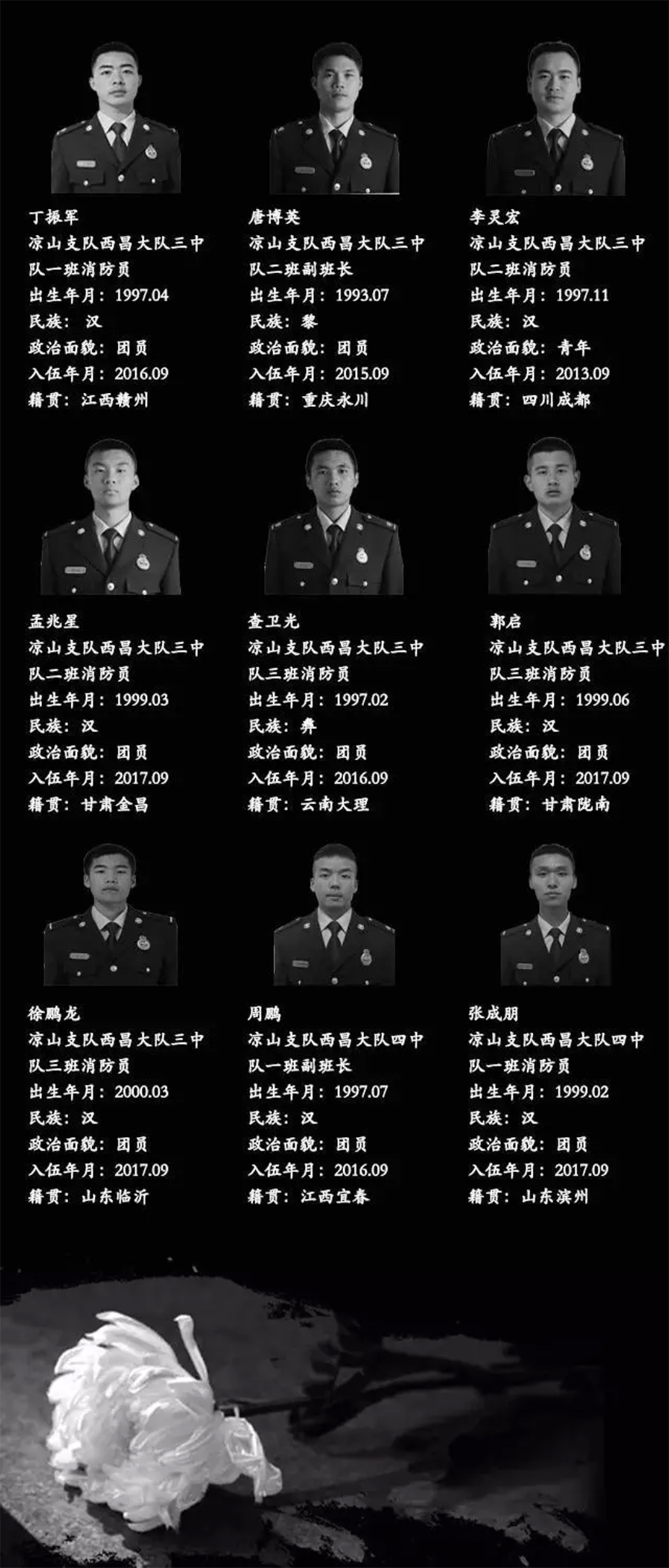 這是一場(chǎng)慘烈的“斗爭(zhēng)”,為了拯救人民財(cái)產(chǎn)、動(dòng)植物等的犧牲,這是一份沉重的名單,經(jīng)統(tǒng)計(jì)核實(shí),有27名同志系涼山州森林消防支隊(duì)指戰(zhàn)員。27人中有干部4人、消防員23人。漢族22人、滿(mǎn)族1人、黎族1人、彝族2人、畬族1人。1980年后出生1人,1990年后出生24人,2000年后出生2人,年齡最小為2000年7月出生。中共黨員9人(含預(yù)備黨員1人),共青團(tuán)員11人,青年7人。