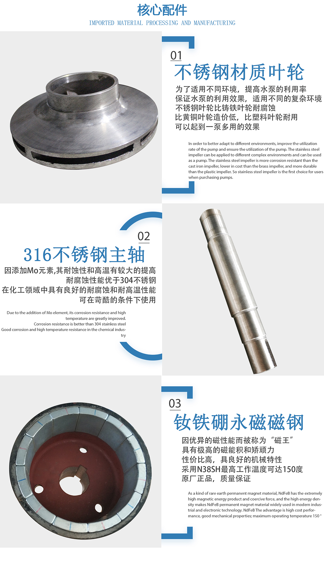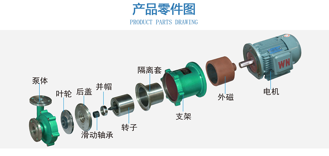 設(shè)計(jì)特點(diǎn):磁力泵以靜密封取代動(dòng)密封,使泵的過(guò)流部件處于完全密封狀態(tài),徹底解決了其他泵機(jī)械密封無(wú)法避免的跑、冒、滴之弊病。用途:可廣泛應(yīng)用于化工、制藥、石油、電鍍、食品、電影照相洗印、科研機(jī)構(gòu)、國(guó)防工業(yè)等單位抽送酸、堿液、油類、稀有貴重液、毒液、揮發(fā)性液體,以及循環(huán)水設(shè)備配套、過(guò)濾機(jī)配套。特別是漏、易燃、易爆液體的抽送,選用此泵則更為理想。。流量范圍:1.2T/h-60T/h,揚(yáng)程范圍:5m-50m,功率范圍:0.12kw-18.5kw,運(yùn)行溫度:-30℃—120℃??筛鶕?jù)實(shí)際工況要求變更配置。