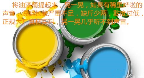 將油漆桶提起來,晃一晃,如果有稀里嘩啦的聲音,說明包裝嚴重不足,缺斤少兩,黏度過低,正規(guī)大廠真材實料,晃一晃幾乎聽不到聲音。